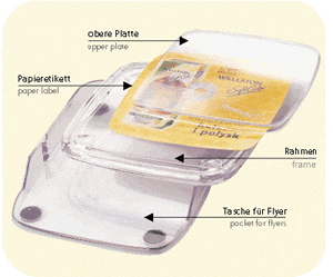 Este producto está hecho de plástico. Es sólido y transparente. Por dentro está la etiqueta en la que pone el nombre de su empresa. El margen de la bandeja es alto para que el dinero no se cae fuera. Además todos los modelos están provistos de un dispositivo antideslizante de gomaespuma.