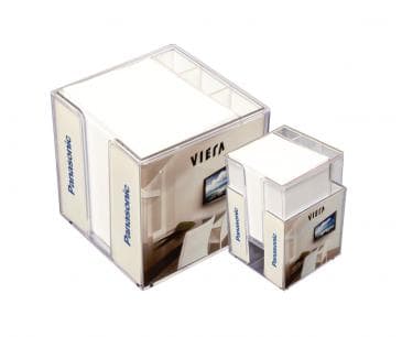Die Box wird aus hoch durchsichtigem Acryl-Styrol-Stoff, deren Seitenwände ideal als Werbeaufdrucke dienen können, angefertigt. Zusätzlich befindet sich innerhalb der Box eine Scheidewand, die die Papierblätter von dem Raum für Kugelschreiber abtrennt.